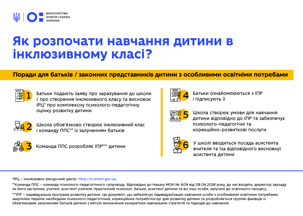 - Наказом директора в закладі освіти створюється команада психолого-педагогічного супроводу, відповідно до Наказу МОН № 609 від 08.06.2018 року, до якої входять: директор закладу чи його заступник, учителі, асистент учителя, практичний психолог, батьки, асистент дитини та всі інші особи, залучені до навчального процесу. Команда супроводу створює індивідуальну програму розвитку (ІПР) дитини.