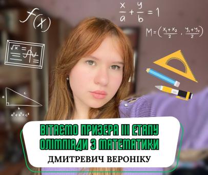 Вітаємо Дмитревич Вероніку, ученицю 10 класу КЗ «Дергачівський ліцей № 3», яка в складній боротьбі за результатами двох турів виборола ІІІ місце в ІІІ (обласному) етапі Всеукраїнської учнівської олімпіади з математики у 2024/2025 навчальному році.