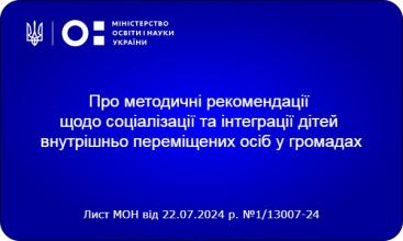 Лист МОН від 22.07.2024 р. №1/13007-24 "Про методичні рекомендації щодо соціалізації та інтеграції дітей внутрішньо переміщених осіб у громадах"