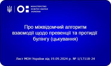 Міжвідомчий алгоритм розроблено з метою формування безпечної, ненасильницької та відповідальної поведінки учнів, підвищення обізнаності працівників закладів освіти, батьків або законних представників дітей щодо запобігання та протидії булінгу.