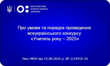 У Міністерстві освіти і науки України визначено умови і порядок проведення всеукраїнського конкурсу «Учитель року – 2025», про що йдеться в листі Міністерства від 19.08.2024 № 1/14910-24 "Про умови та порядок проведення всеукраїнського конкурсу «Учитель року - 2025»"