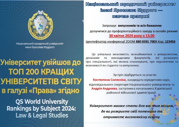 Національний юридичний університет імені Ярослава Мудрого запрошує випускників та всіх бажаючих долучитися 30 квітня 2024 року о 13.00 до профорієнтаційного заходу в онлайн режимі.