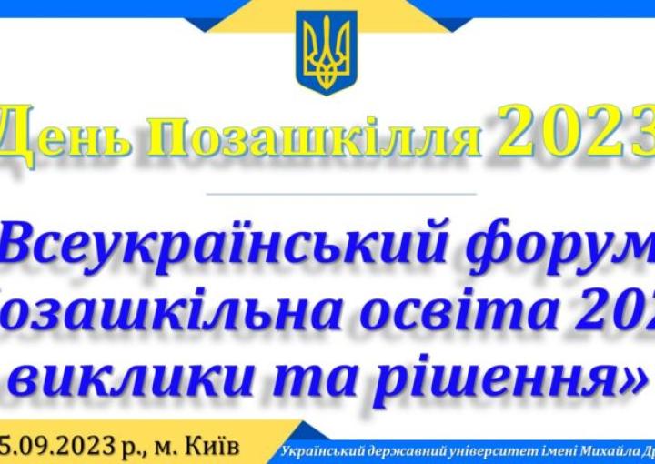 Державна наукова установа «Інститут модернізації змісту освіти» інформує, що 25-26 вересня 2023 року з нагоди Дня позашкілля відбудеться Всеукраїнський форум «Позашкільна освіта 2023: сучасні виклики та рішення» (лист ІМЗО №21/08-1357 від 23.08.2023).