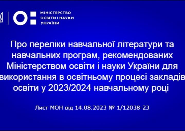 З метою упорядкування літератури, що рекомендується для використання в закладах освіти, Міністерство освіти і науки України надало переліки навчальної літератури та навчальних програм, рекомендованих Міністерством освіти і науки України для використання в освітньому процесі закладів освіти у 2023/2024 навчальному році (лист МОН від 14.08.2023 № 1/12038-23).