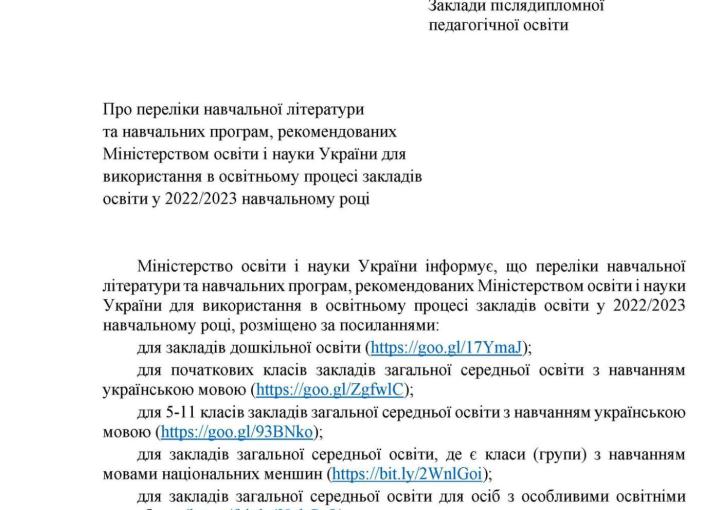 Лист МОН від 09.08.2021 № 1/9-404 “Про переліки навчальної літератури та навчальних програм, рекомендованих Міністерством освіти і науки України для використання в освітньому процесі закладів освіти у 2021/2022 навчальному році”
